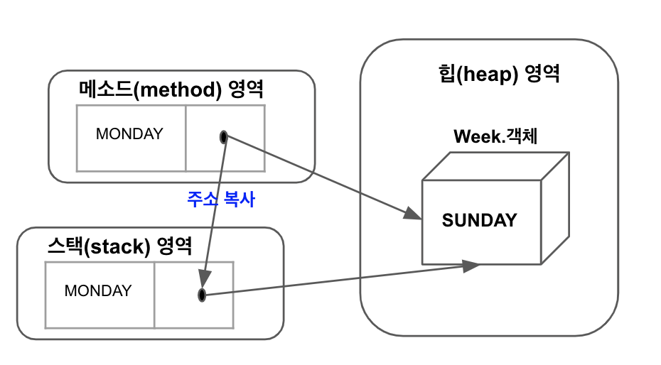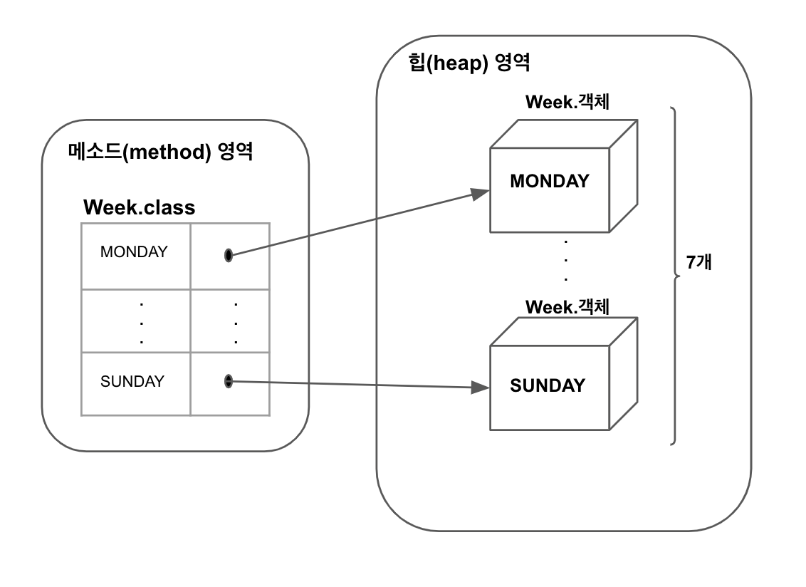 메소드 영역에 생성된 열거 상수가 해당 Week 객체를 각각 참조한다.