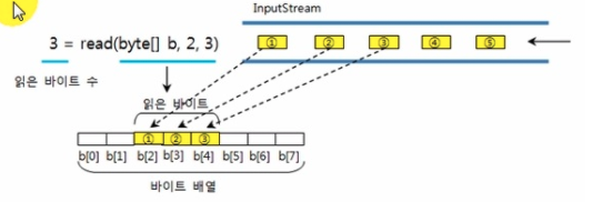 · read(byte[] b)와 차이점: 한 번에 읽어들이는 바이트 수를 len 매개값으로 조절 가능, 배열에서 저장이 시작되는 인덱스 지정 가능