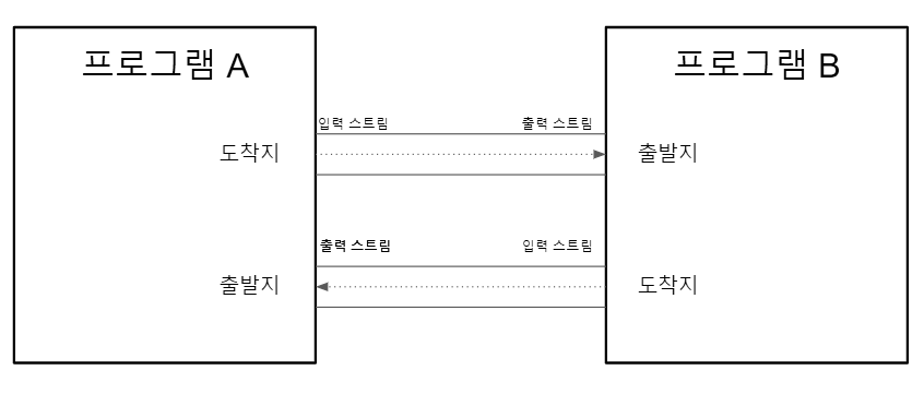 - 프로그램이 네트워크상의 다른 프로그램과 데이터 교환을 하기 위해서는 양쪽 모두 입력 스트림과 출력 스트림이 따로 필요