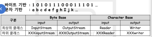 바이트 기반 스트림과 문자 기반 스트림은 최상위 클래스에 따라 다음과 같이 구분된다.