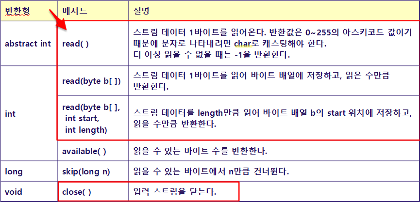 · 더 이상 입력 스트림으로부터 바이트를 읽을 수 없다면, read() 메소드는 -1을 리턴
