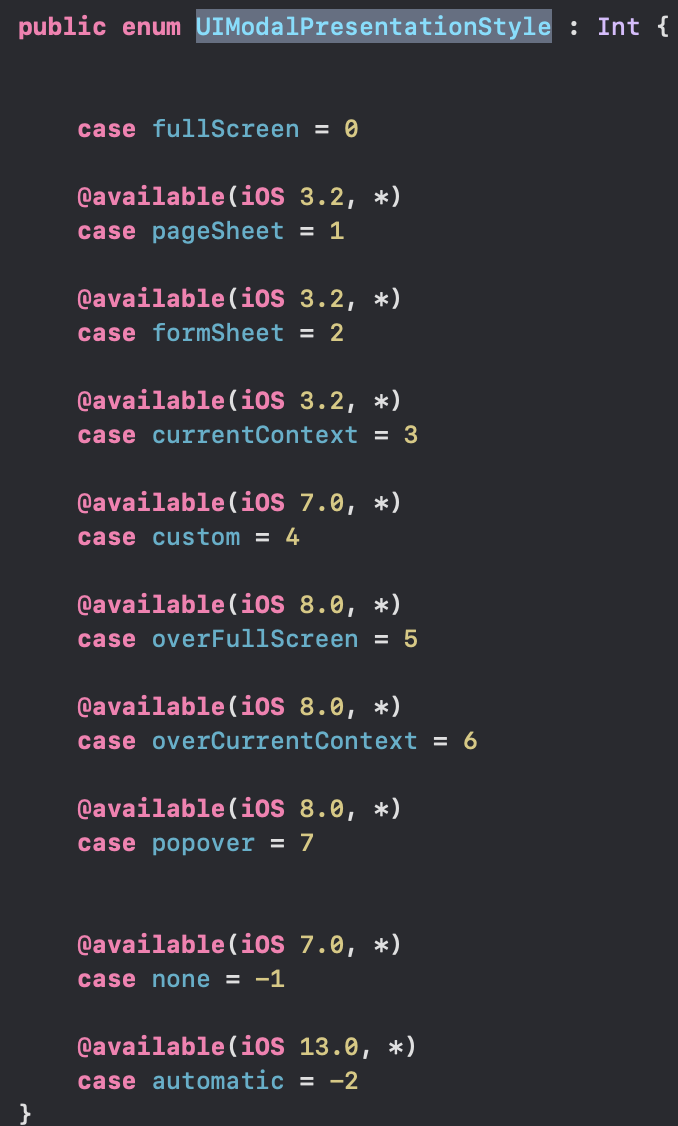 이러한 iOS의 UIKit의 UIModalPresentationStyle에는 여러가지 모달 스타일이 정의되어있다. 모달 스타일은 서로 다른 모양과 생명 주기를 갖는다.
