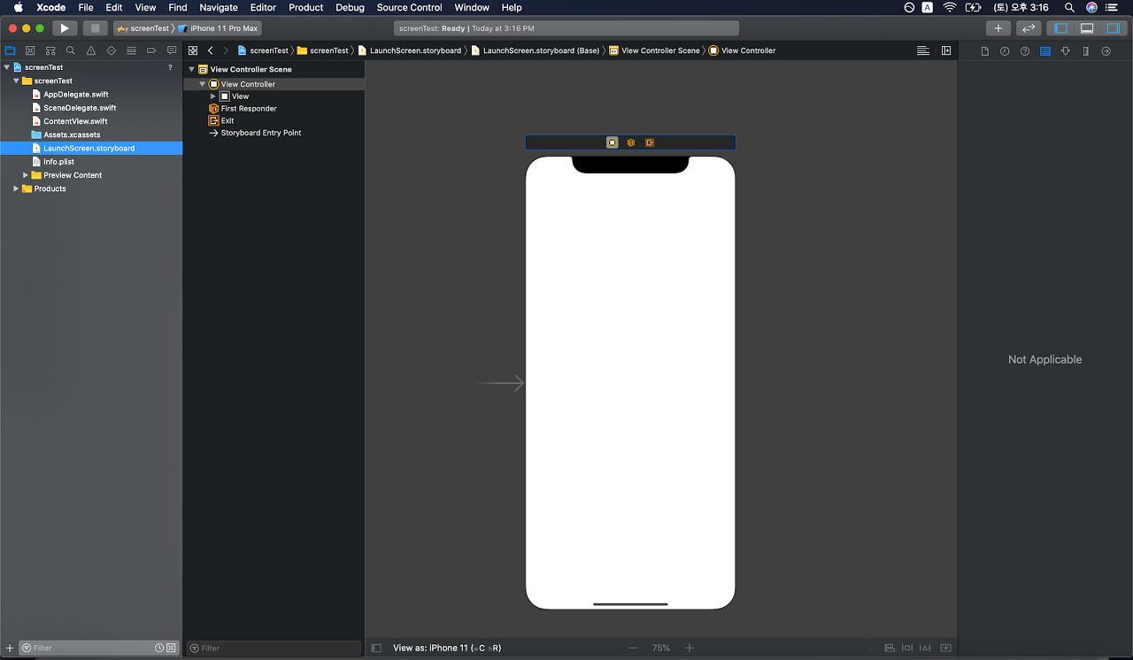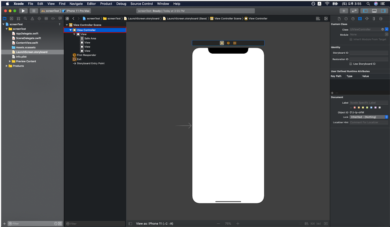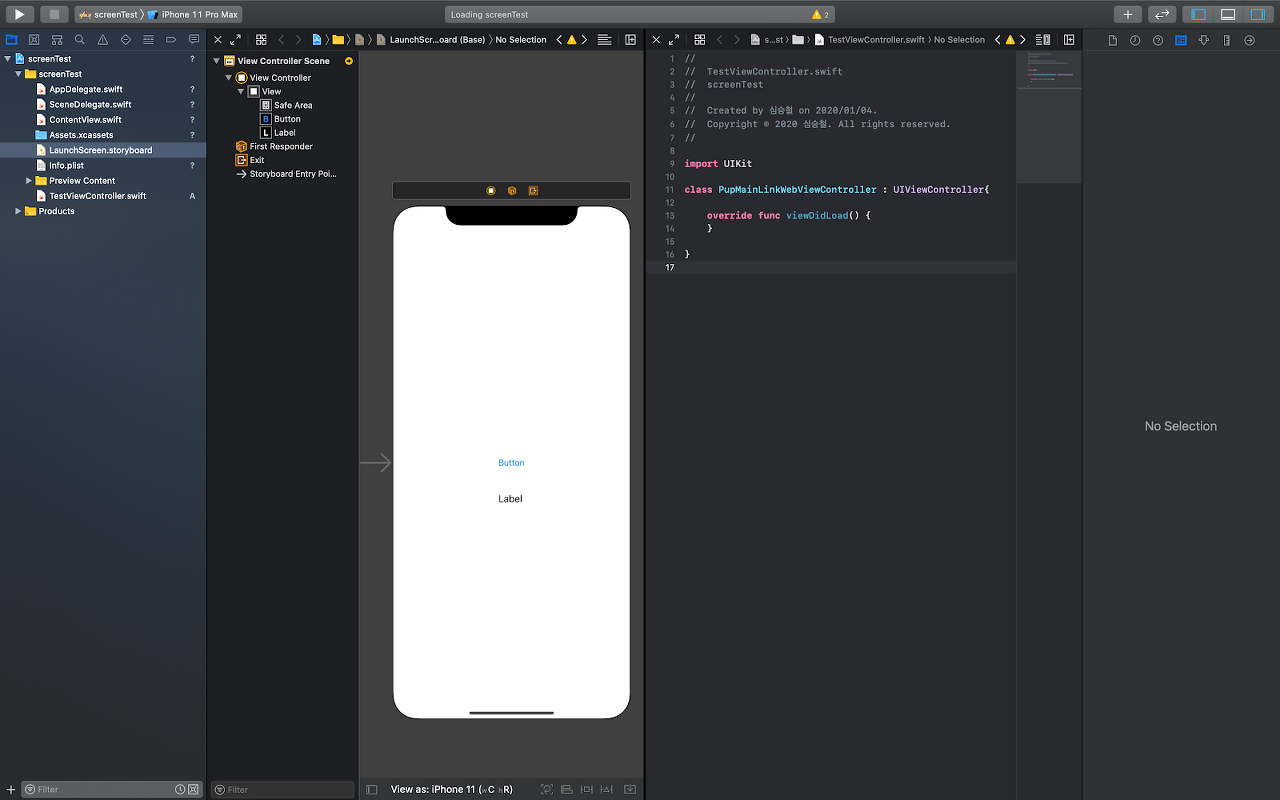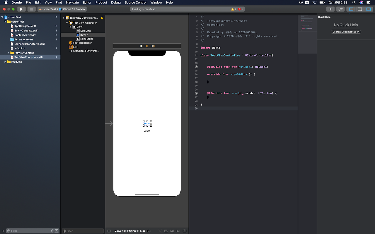 이번에는 생성된 화면에 뷰 컨트롤러를 스위프트 언어를 통해 조작하기 위한 설정을 진행하겠습니다.