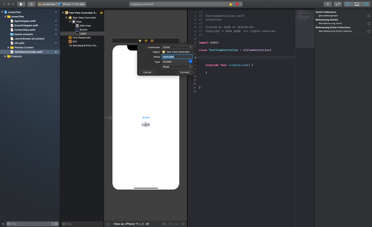 그러면 아래 화면처럼 ‘Label’ 사용을 위한 선택란들이 나오는데 Connection에 Outlet, Name에 numLabel, Type에 UILabel을 입력하고, connect 버튼을 누르면 아웃렛 변수가 생성됩니다.