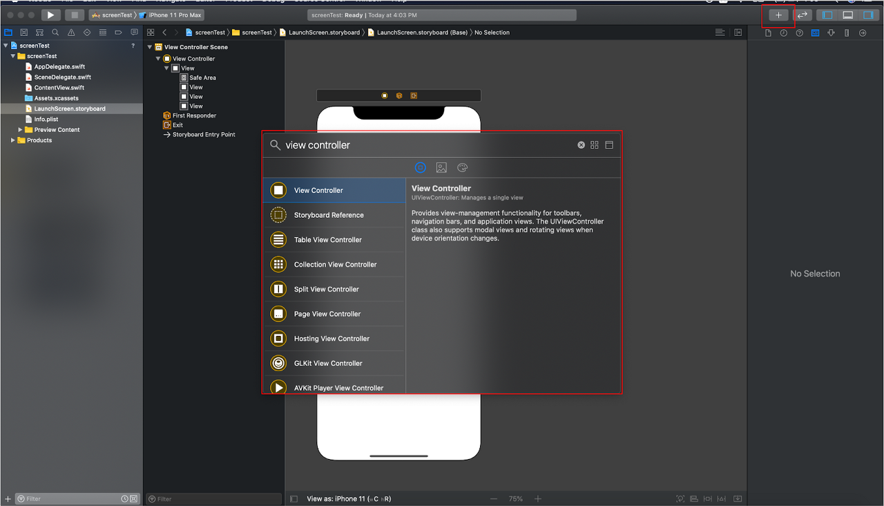 xcode 상단의 ‘+’ 모양 버튼을 누르면 IOS의 화면을 구성하는 ‘오브젝트 라이브러리’들을 확인할 수 있습니다.