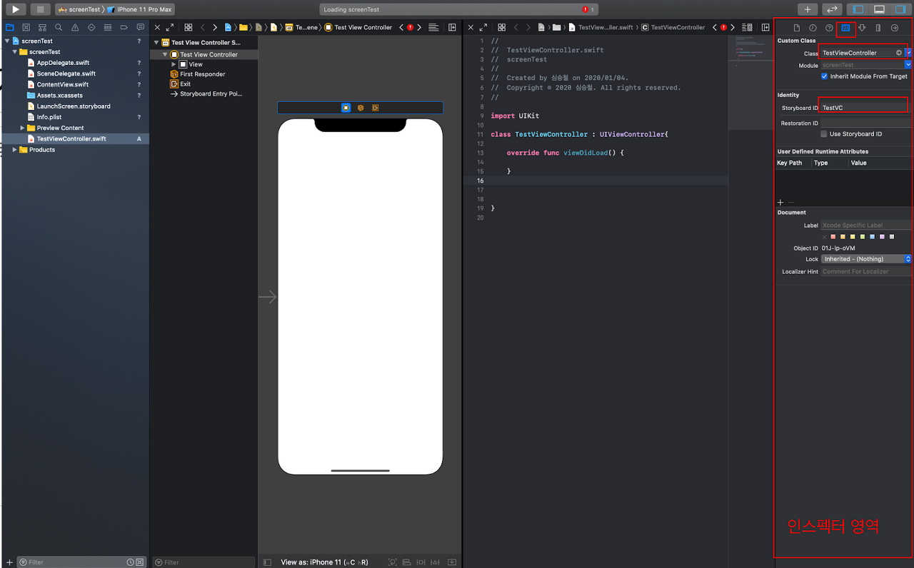 마지막으로 ‘Storyboard ID’에 ‘TestVC’를 입력합니다. Storyboard ID는 스위프트 파일에서 조작을 원하는 View Controller를 스토리보드로 부터 얻어 올 때 사용하는 아이디입니다.