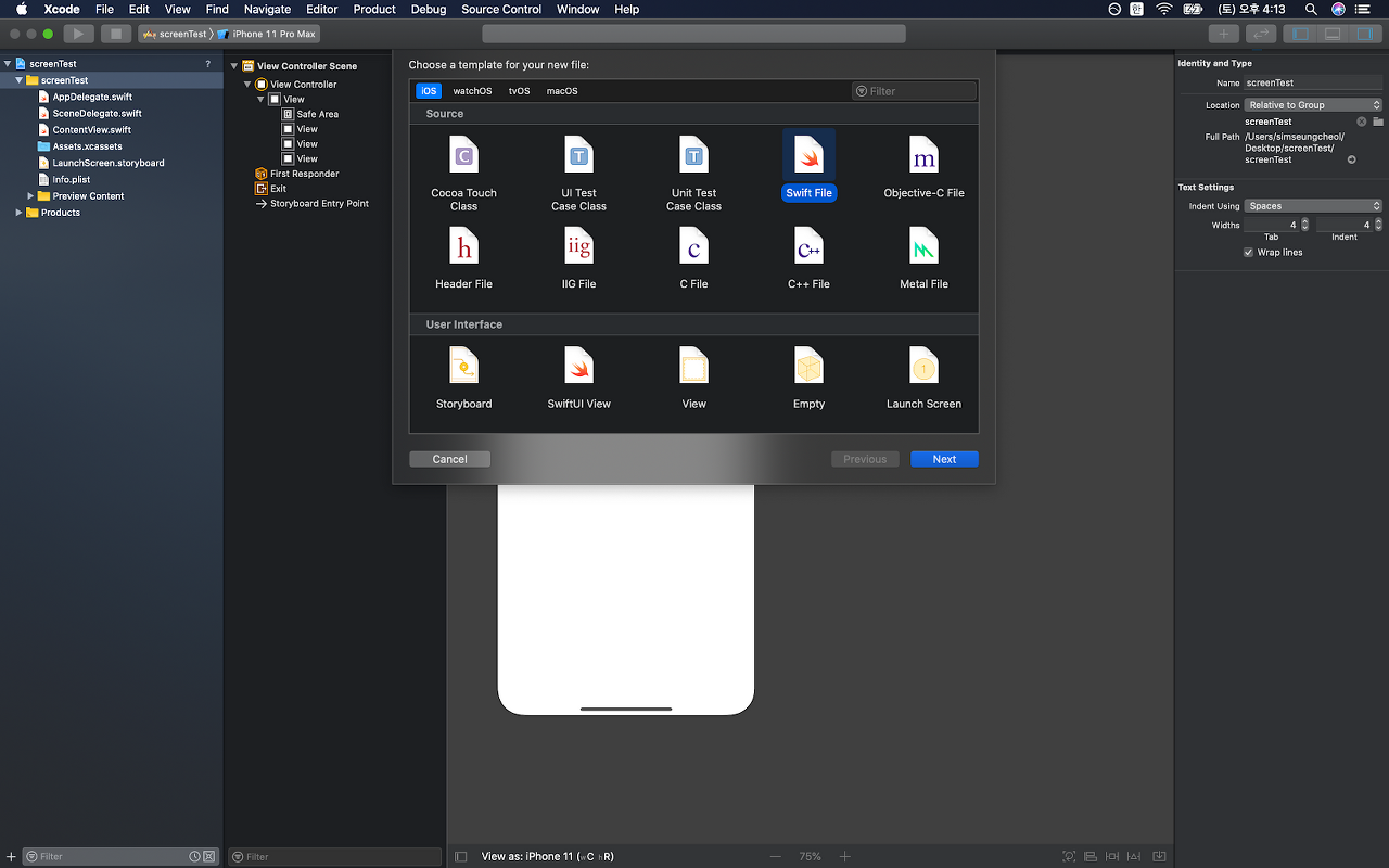 먼저 스위프트 파일을 생성합니다. xcode 프로젝트의 현재 디렉토리를 우클릭하여 New File -> 스위프트 파일을 선택합니다. 파일이름은 testViewController로 하겠습니다.