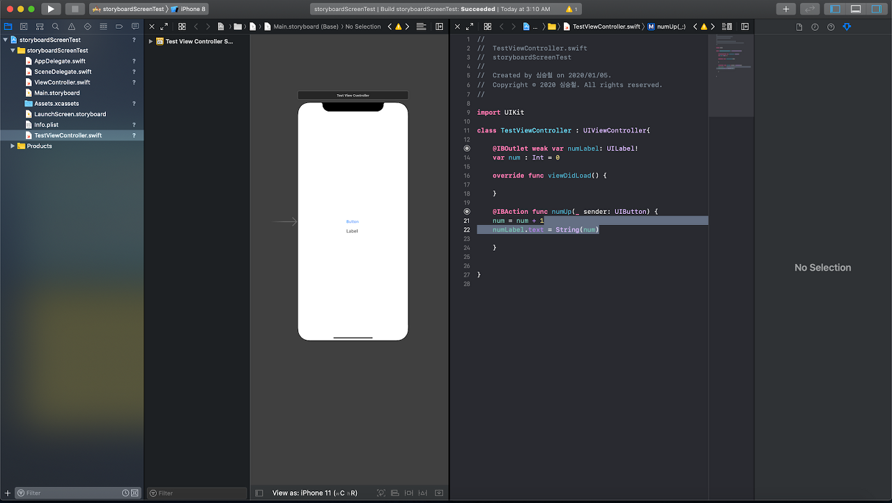 그리고 방금 추가한 액션 메소드 내부에 버튼 클릭시 num 변수의 값을 1씩 올린 후 레이블에 입력하는 코드를 아래와 같이 입력하면, 버튼을 누를 때마다 레이블에 쓰여진 숫자가 증가하는 앱이 완성됩니다!