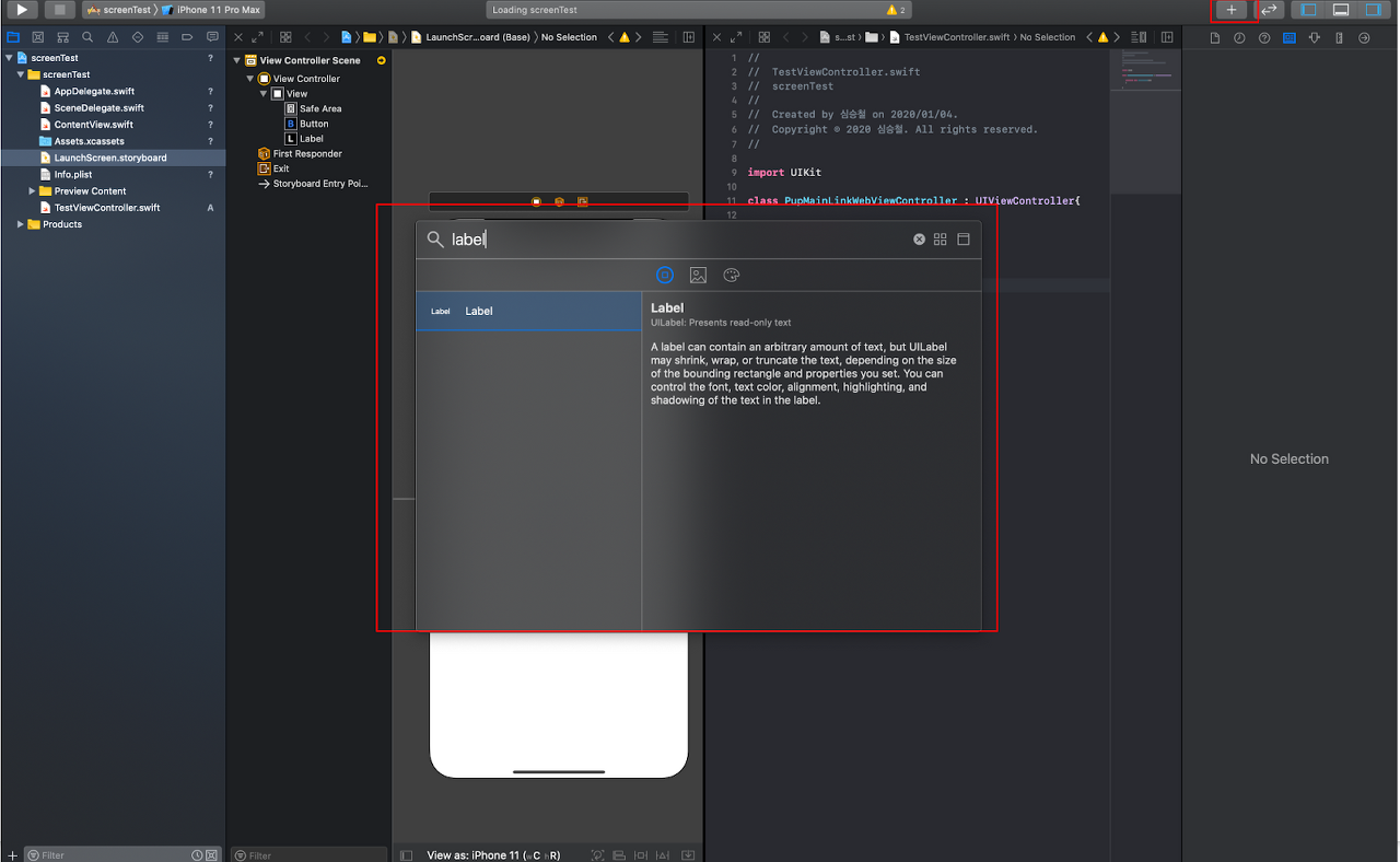 xcode 상단의 ‘+’ 모양 버튼을 눌러서 ‘오브젝트 라이브러리’ 중 ‘Button’과 ‘Label’을 선택해서 화면으로 드래그합니다.