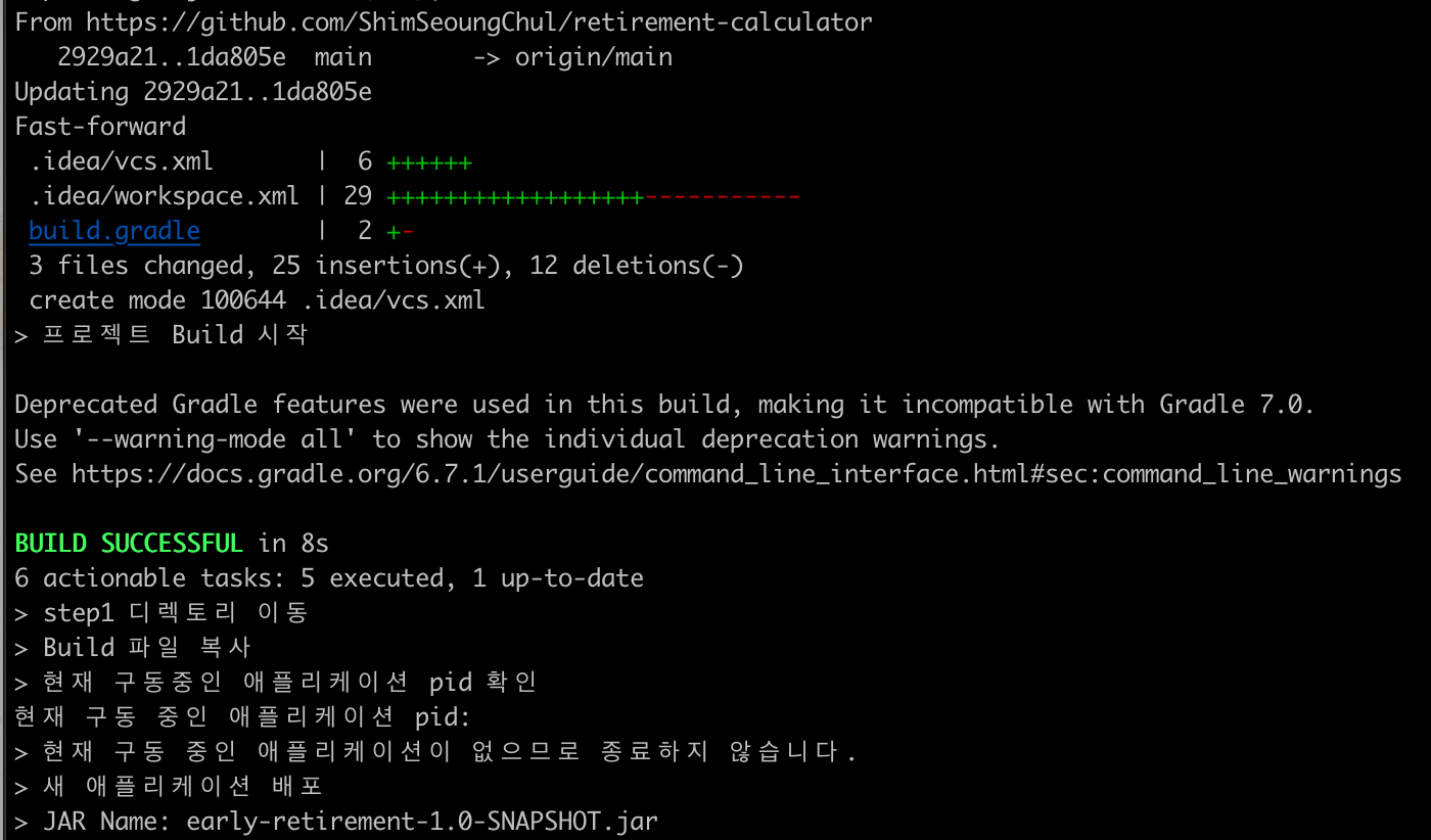 이런 과정을 배포할 때마다 개발자가 하나하나 명령어를 실행하는 것을 불편하다. 그래서 이를 쉘 스크립트로 작성해 스크립트만 실행하면 앞의 과정이 차례로 진행되도록 한다.