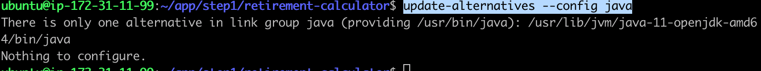 설치가 완료되면 인스턴스의 Java 버전을 11로 변경한다. (다음 명령어로 자바 버전이 여러 개일 때 원하는 버전을 선택할 수 있다. 현재는 자바 버전이 11 한 개만 존재한다.)