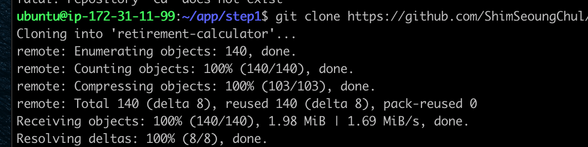 git clone 받은 디렉토리(home/유저이름/app/step1/프로젝트이름)로 이동한다.