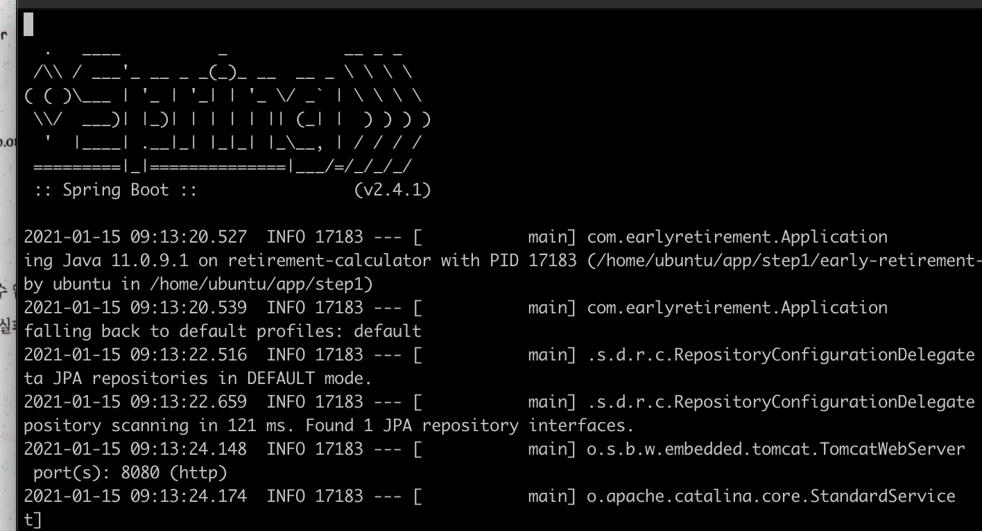 찾은 jar 파일을 nohub으로 실행한다. 여기서 스프링 부트의 장점을 볼 수 있다. 외장 톰캣을 사용하지 않아도 jar 파일만 있으면 내장 톰캣으로 웹 애플리케이션 서버를 실행할 수 있다.