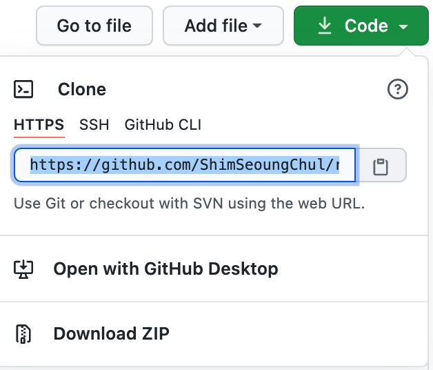 본인의 깃허브 웹페이지에서 https 주소를 복사한다.