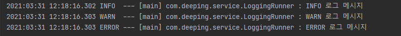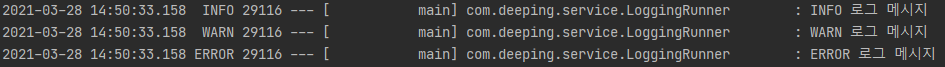 이제 스프링부트 프로젝트를 다시 시작하면, 콘솔에 com.deeping 패키지로 시작하는 INFO 이상의 로그가 출력되는 것을 확인할 수 있다.