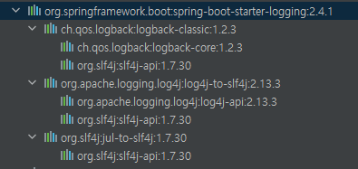스프링 부트 프로젝트를 생성하고, 의존관계를 확인해보면 logging 스타터를 이용하여 기본적으로Logback과 Log4j를 SLF4J 구현체로 가지고 있는 걸 확인할 수 있다.