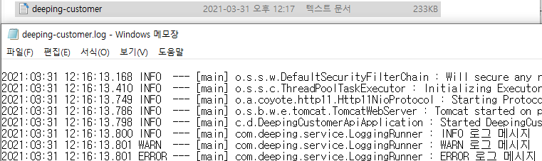 <file>로 로그 파일의 위치와 이름을 지정할 수 있다. 위 설정은 C:/Users/tlatm/Desktop/log 디렉토리에 deeping-customer.log 파일을 생성하고, 로그 메시지를 출력하라는 설정이다.