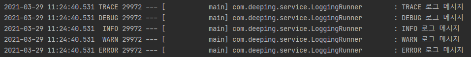 | 5.TRACE | GREEN | DEBUG 레벨 보다 좀더 상세한 메시지 |