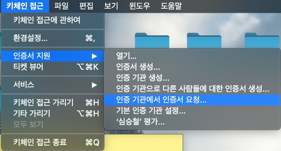 맥의 spotlight 검색을 통해 키체인을 검색하고 해당 탭에서 다음과 같이 CSR을 발급합니다.