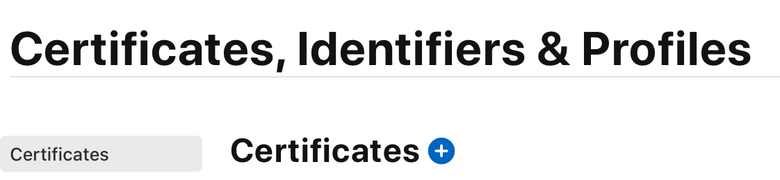 애플 개발자 사이트(https://developer.apple.com/kr/)에 접속한후 아래 이미지처럼 Certificates 탭에 들어가 '+' 버튼을 클릭하여,