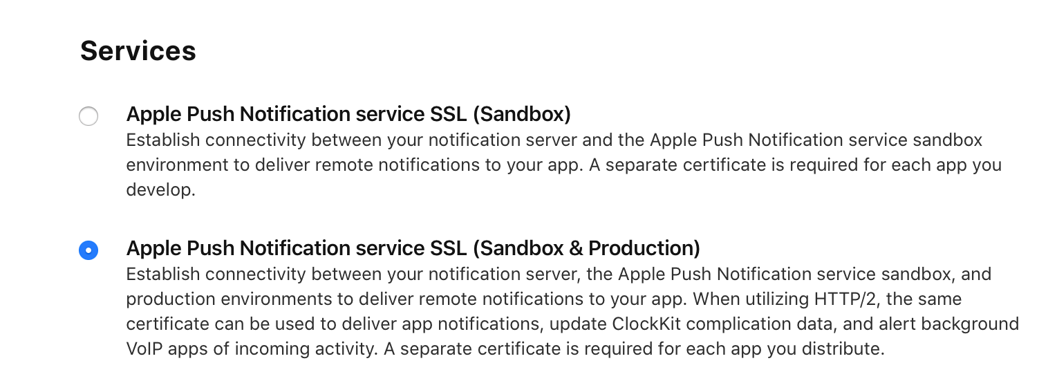 해당 페이지에서 Apple Push Notification Service SSL(상단은 개발용, 하단은 배포용입니다.)을 선택 후 'Continue' 버튼을 클릭하세요.
