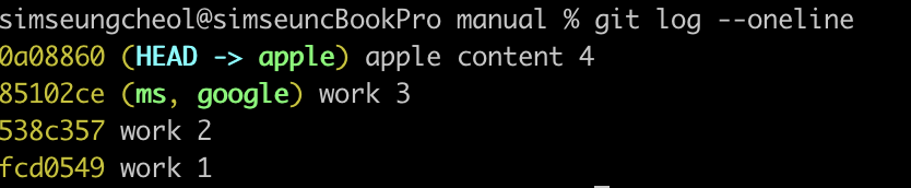 첫 번째 줄(HEAD -> apple)을 통해 apple 브랜치에 체크아웃한 상태이고, apple 브랜치의 최신 커밋은 ‘apple content 4’임을 알 수 있다.