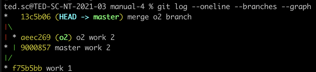 ✍ 현재 커밋 상태를 확인하면, 커밋 ‘work 1’은 master 브랜치와 o2 브랜치 모두 가지고 있다. 그리고 master 브랜치에는 ‘master work 2’ 커밋이, o2 브랜치에는 ‘o2 work 2’ 커밋이 생겼다.