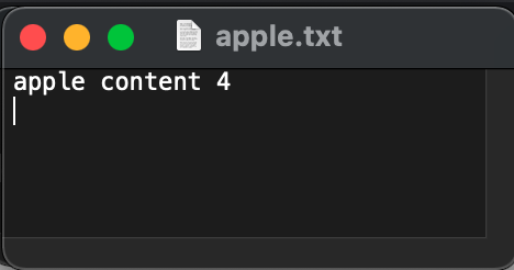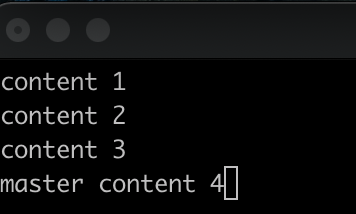 master 브랜치에서 입력했던 ‘master content 4’가 없는 것으로, apple 브랜치가 master 브랜치에서 분기된 이후 master 브랜치에 추가된 커밋은 apple 브랜치에 영향을 미치지 않은 것을 알 수 있다.