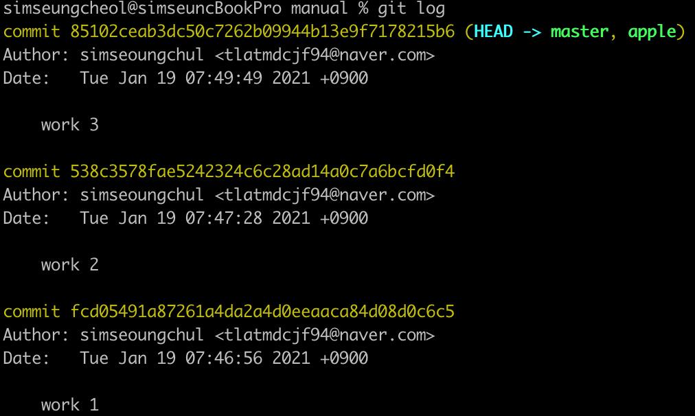 git log를 입력해서 커밋 내역을 확인한다. 최신 커밋인 “work 3”을 가리키고, HEAD가 master 브랜치를 가리킨다.
