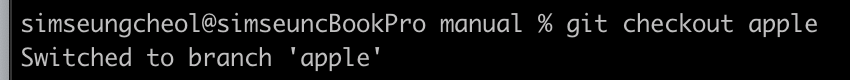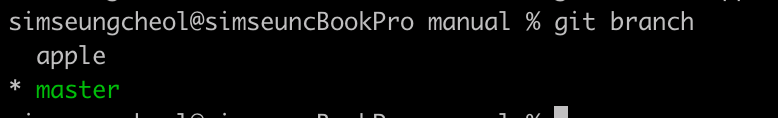 다시 현재 저장소에 브랜치를 확인하면, master 브랜치 위에 apple 브랜치가 추가되었다. 브랜치 앞에 * 표시는 해당 브랜치에서 작업하고 있다는 뜻이다.