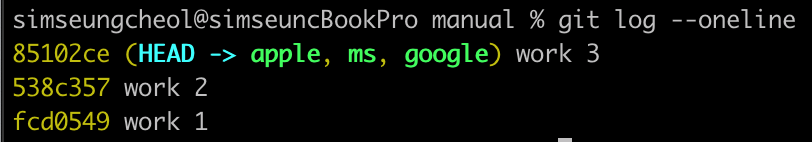 최신 커밋인 ‘master work 4’는 master 브랜치에만 적용되었고, ms, google, apple 브랜치는 아직 ‘work 3’ 커밋 상태다.