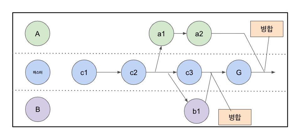 만들어진 각 브랜치에서 작업을 하다가 어느 시점에는 브랜치 작업을 마무리하고 기존 브랜치와 합해야 한다. 이것을 “브랜치 병합(merge)”이라고 한다.