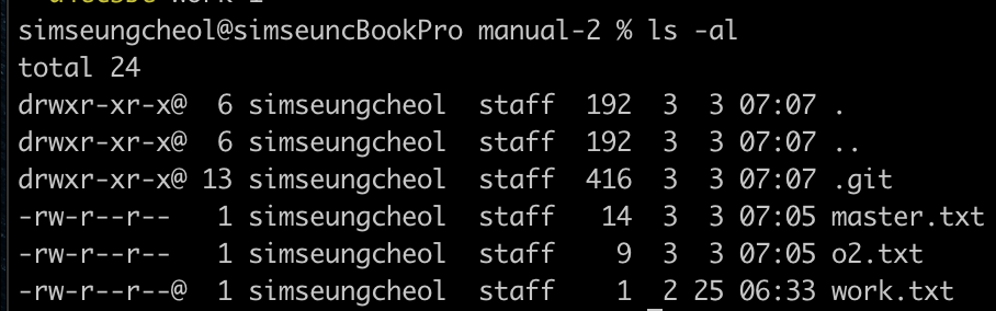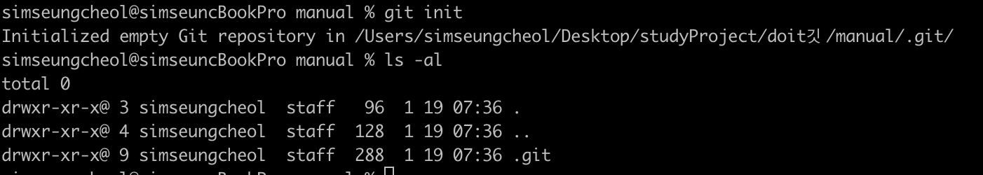 manual 디렉터리를 저장소로 만들고 ls -al 명령을 사용해서 .git 디렉터리가 만들어졌는지 확인한다.