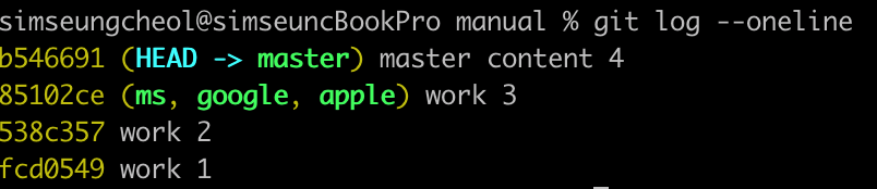 git log 명령어에 --oneline 옵션을 추가해서 커밋 로그를 확인한다. --oneline 옵션은 한 줄에 한 커밋씩 커밋을 간략히 보여준다.