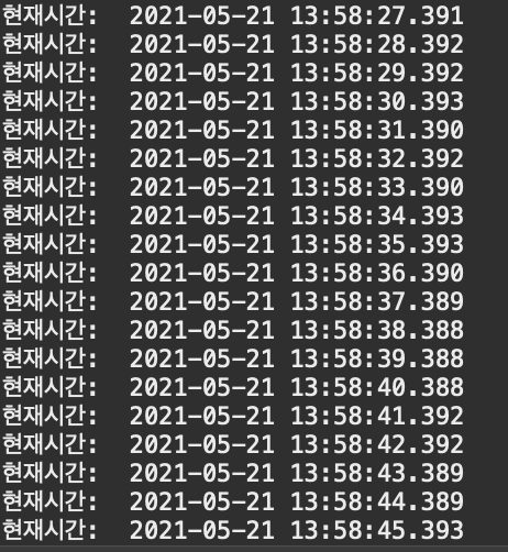 이제 @Scheduled 어노테이션 기능을 사용하기 위한 초기 설정은 끝이났다. 프로젝트를 실행하면 아래와 같이 1초에 한 번 firstTask() 메소드에 선언된 내용이 실행된다.