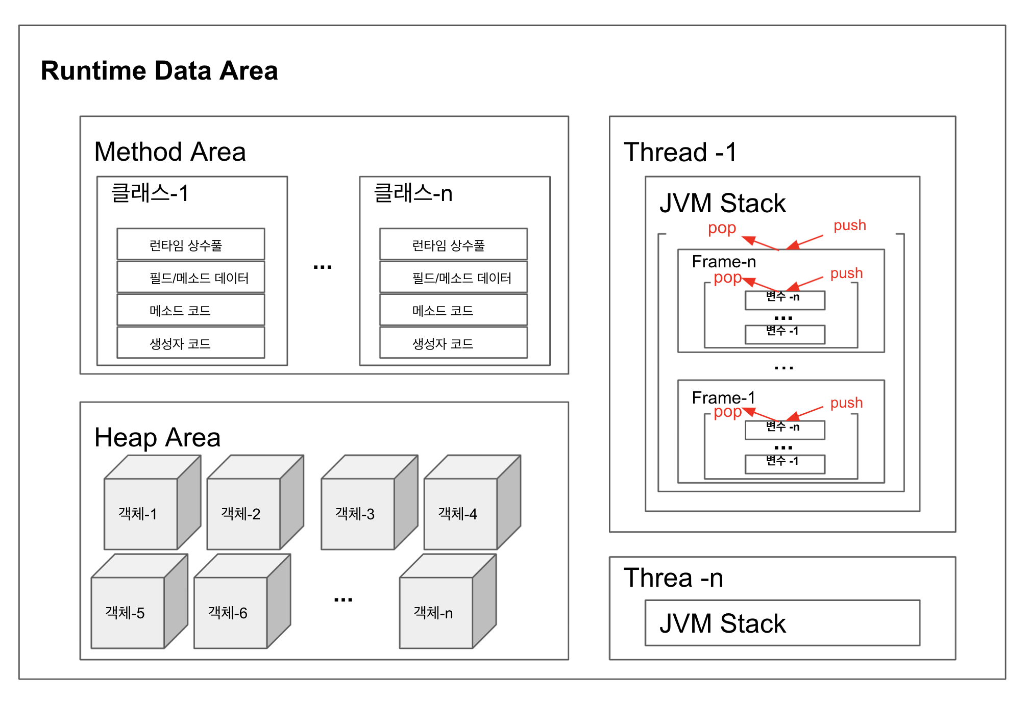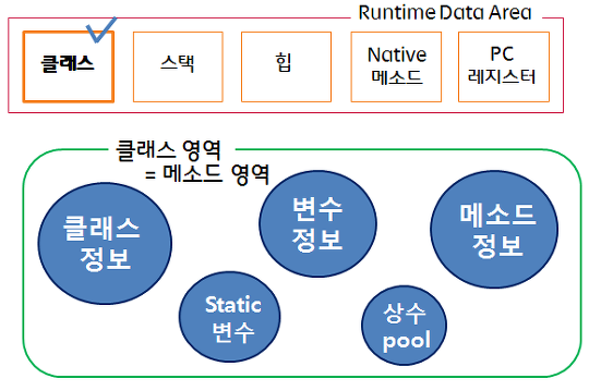 - 클래스파일을 클래스 로더로 읽어 클래스별로 런타임 상수풀(runtime constant pooll), 필드 데이터, 메소드 데이터, 메소드 코드, 생성자 코드, 변수 정보, static 변수 등으로 분류해서 저장