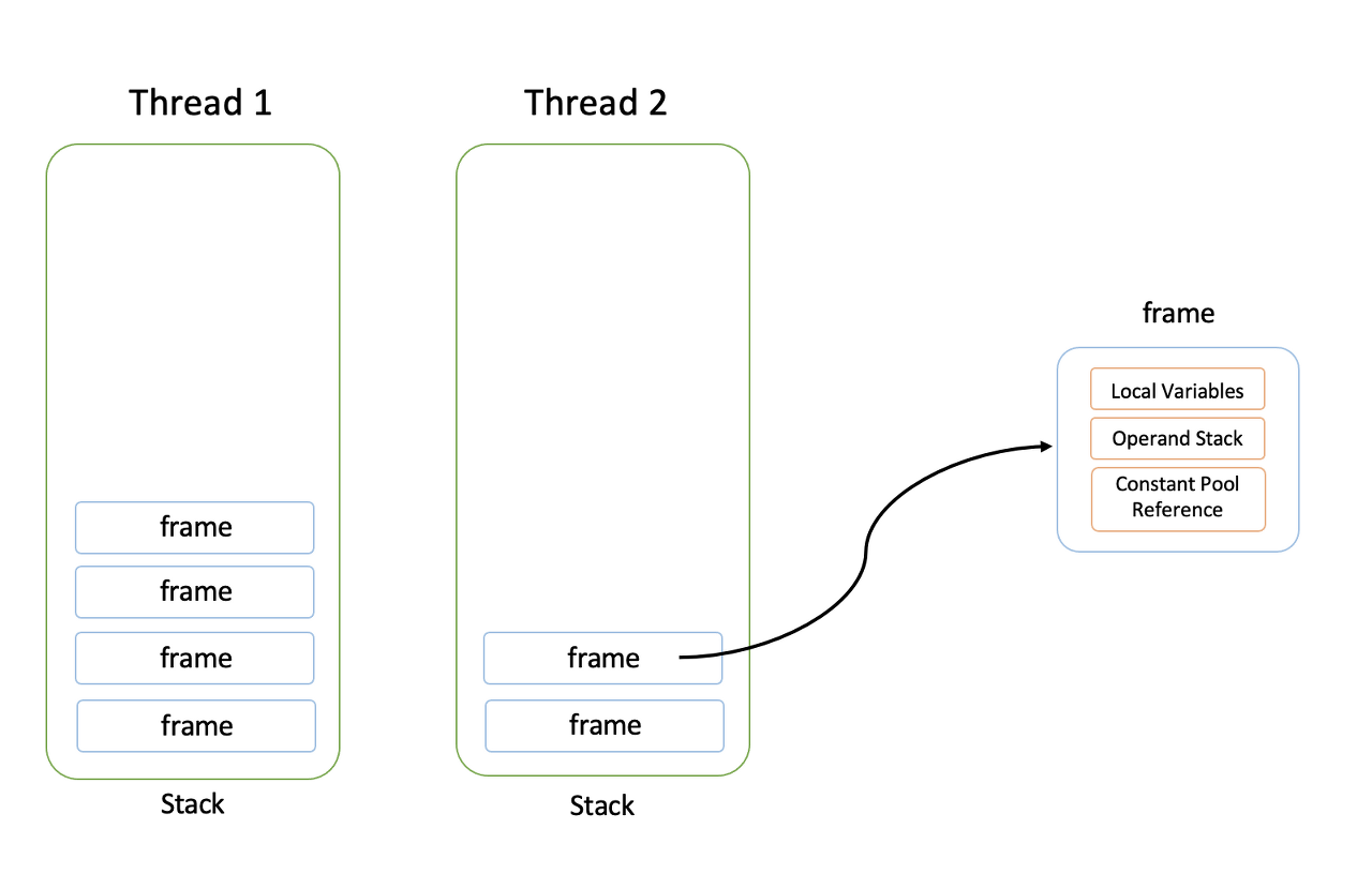 - 프레임은 함수 실행 시 생성되는 변수, 연산 스택, 상수 풀 참조들을 담는다.