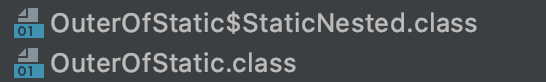 · 컴파일 결과를 보면 Nested 클래스를 감싸고 있는 이름 뒤에 $를 붙인 후 Nested 클래스의 이름이 나오고, 별도의 클래스 파일로 만들어진다.