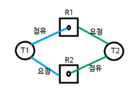 4. 순환대기(Circular wait): 각 프로세스는 순환적으로 다음 프로세스가 요구하는 자원을 가지고 있음
