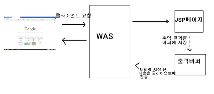 · JSP 페이지는 응답 결과를 곧바로 웹 브라우저로 전송하지 않고,