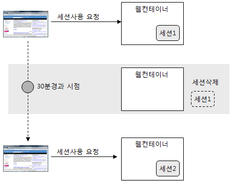 · 세션은 마지막 접근 이후 일정 시간 이내에 다시 세션에 접근하지 않는 경우 자동으로 세션을 종료하는 기능이 존재함 (타임 아웃 기능)