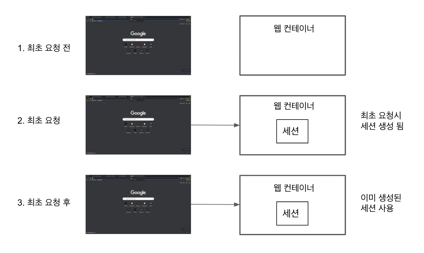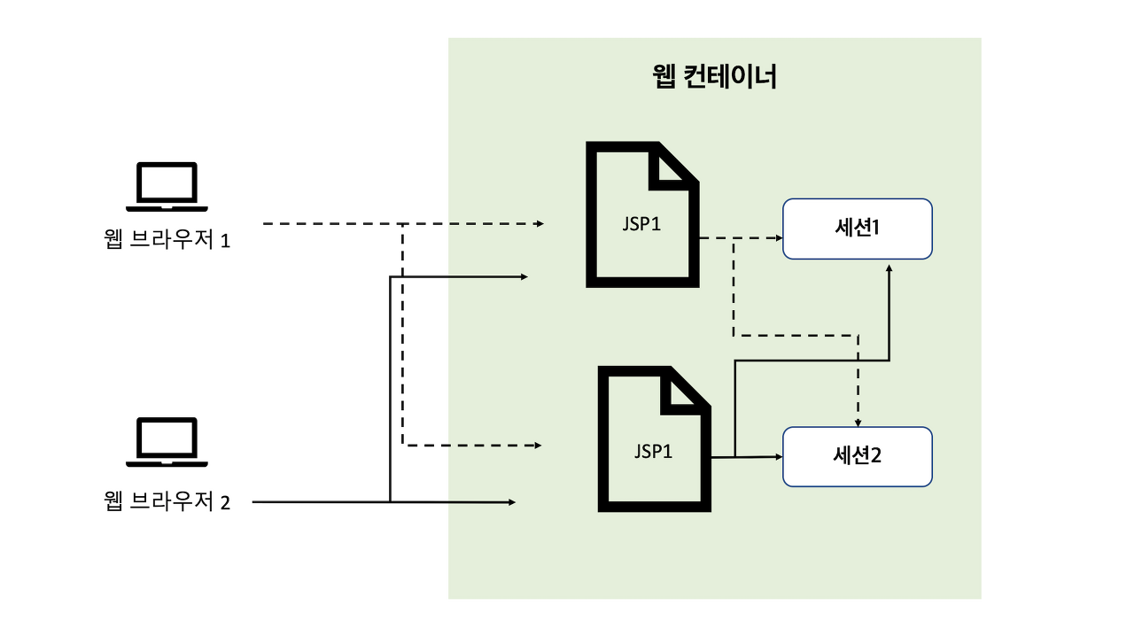 · 웹 컨테이너는 기본적으로 한 웹 브라우저마다 한 세션을 생성함