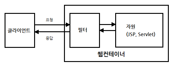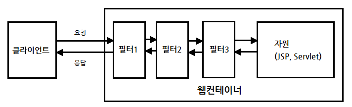 - 웹브라우저의 요청은 서블릿/JSP에 전달되기 전에 필터를 통과하므로,