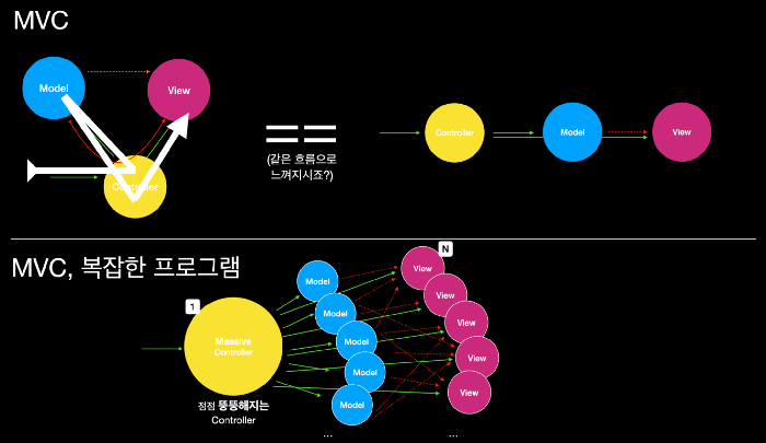 · 위 그림과 같이 복잡한 대규모 프로그램에서 Controller에 다수의 Model과 View가 복잡하게 연결되어, 새 기능을 추가할 때마다 문제가 발생하고, 코드 분석과 테스트도 어려워질 수 있음