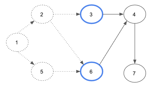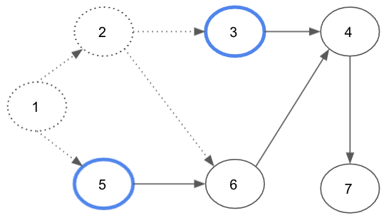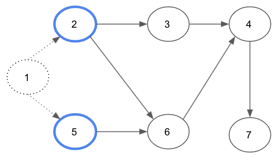 새롭게 노드 2와 노드 5의 진입차수가 0이 되므로, 해당 노드들을 큐에 삽입한다.
