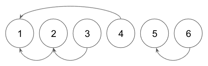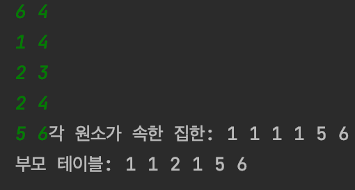 · 위의 4가지 union 연산들의 의미: 1과 4는 같은 집합, 2와 3은 같은 집합, 2와 4는 같은 집합, 5와 6은 같은 집합
