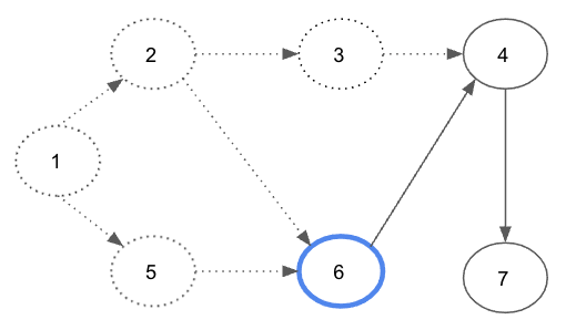 Step 5. 큐에 들어 있는 노드 6을 꺼내고, 노드 4와 연결된 간선을 제거한다.
