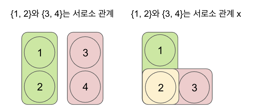 · 두 집합이 서로소 관계인지 확인 == 각 집합이 어떤 원소를 공통으로 가지고 있는지 확인