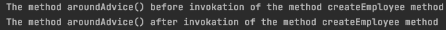 System.out.println("The method aroundAdvice() after invokation of the method " + joinPoint.getSignature().getName() + " method");