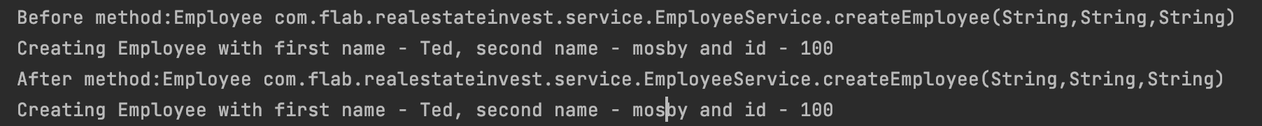 @After(value = "execution(* com.flab.realestateinvest.service.EmployeeService.*(..)) and args(empId, fname, sname)")